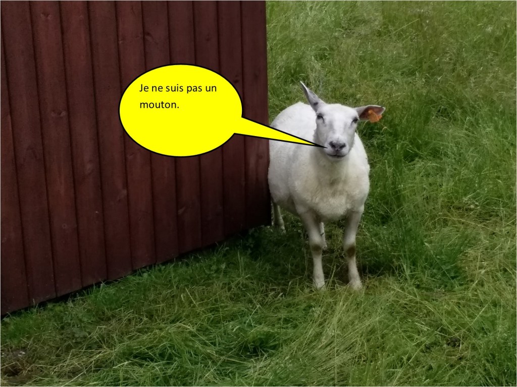 Contrairement aux apparences, je ne suis pas un mouton. Il croit me souvenir que je suis un EHS étiqueté et tondu. J’ai trouvé refuge dans une zone verte où j’ai pu déposer mes sabots et reprendre contact avec mon environnement naturel. C’est temporaire, juste le temps de retrouver ma vrai personnalité à l’abri des technologies invasives. Ayant perdu ma combinaison anti-G, je suis obligé de fuir en permanence ou de bricoler avec des bouts de laine. Ici, j’ai le temps de remettre mes idées au clair et de prendre des décisions pour mon futur sans être perturbé par cette technologie toujours plus envahissante. Les 4 pattes dans l’herbe, je me décharge et mon corpsme dit merci. Un séjour dans une zone verte est à la fois sain pour le corps et pour l’esprit. Oublié les remèdes, les anti-dépresseurs, les grigris, juste prendre le temps d’avoir du temps et de se consacrer à soi. C’est un lieu refuge où on retrouve des compagnons qui ont les mêmes soucis, ou on peut échanger, glâner des infos et respirer profondément.