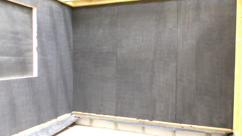 La toiture n’est pas encore posée, mais les murs extérieurs ont été protégés par une pare-pluie, les fenêtres sont obstruées mais j’ai la lumière par le ciel. C’est la première fois que je travaille en noir, ce n’est pas trop difficile à mettre et l’adhérence sur le bois est bonne. J’essaie de vider mon bidon de 5 L dans lequel j’ai ajouté les fibres de carbonne. Je connaitrai ainsi le rendement exact au m² pour commander les prochains pots. J’ai vérifié la conductivité entre les panneaux avec un multimètre. Pour la protection aux ondes, on verra quand le bâtiment sera fermé, en attendant je mets une couche sur 4 façades sur 5, on avisera pour la suite après mesures. Je trouve cette aventure passionante et elle soulève un vif intérêt du voisinage, un journaliste est même venu m’interviewer vendredi. Dimanche, je finis mon pot de peinture et j’attaque pour poser les tuyaux de chauffage.