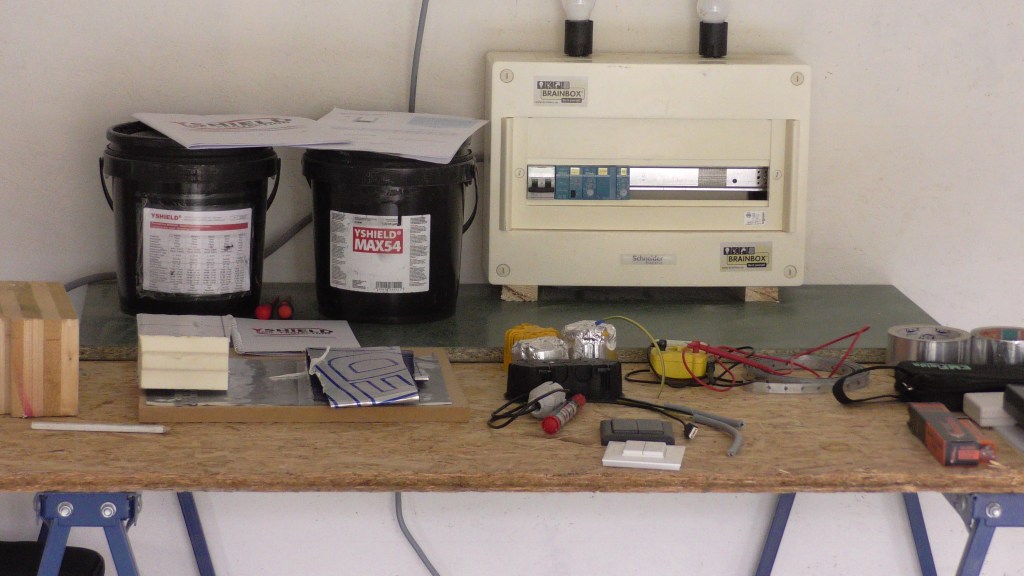 Petit coup de balai sur le chantier pour éliminer un maximum de poussière. La journée porte ouverte de ce dimanche se veut didactique. Elle n’a pas pour but de faire visiter un chantier ou de se glorifier des travaux déjà réalisés dans la sueur et les lamentations mais plutôt de présenter les trucs et astuces mis en oeuvre pour se préserver des ondes dans une nouvelle construction. Le but est de toucher la matière et les moyens utilisés pour que cela ne reste pas une image dans un catalogue ou une idée dont on ne se représente pas toujours les difficultés de la mise en oeuvre. Le chantier a évolué en 2 mois et le coût des matériaux a explosé depuis juin, ce qui nous a obligé à trouver de nouvelles solutions et à limiter nos ambitions. J’ai réuni pour cette journée les différents éléments utilisés pour contrer ou domestiquer les basses et les hautes fréquences. Au plaisir de vous rencontrer.