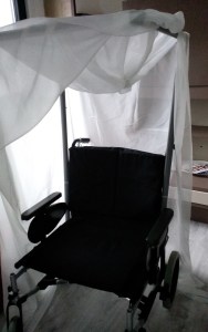 Comme les fêtes de fin d’année ne font pas partie de notre calendrier, autant consacrer ces jours de liesse populaire à perfectionner notre siège anti-ondes et lever un coin du voile. Nous avions voulu tester le projet chez nous, mais faute de source d’exposition dans une zone blanche, les résultats n’étaient pas significatifs. Nous avons donc déplacé le bébé tout neuf dans la maison protégée des ondes. Nouvelle déception, l’endroit n’était de nouveau pas propice à ce genre de test. A force de vouloir se protéger, on ne trouve plus d’endroit pour faire nos tests. Un voisin bienveillant et très bien équipé en pollution électromagnétique, nous a ouvert ses portes et nous avons pu tester en vrai l’efficacité de notre chaise à roulettes. Pour mesurer sous la toile de protection, nous avons utilisé divers appareils en ayant soin de mesurer d’abord sans la protection afin de pouvoir comparer.