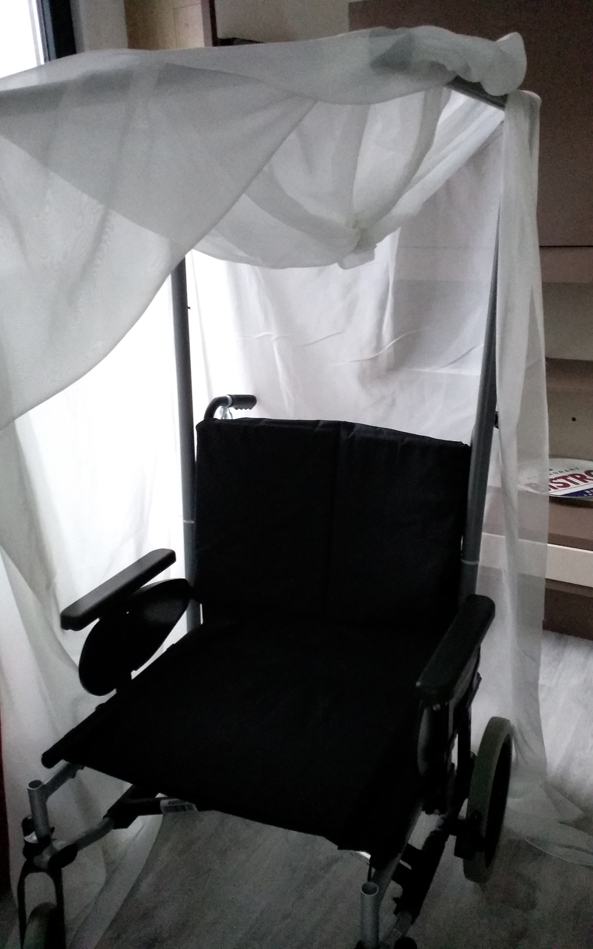 La chaise pour EHS est à sa 3ème version. Tout d’abord elle a été adaptée sur une chaise de jardin, ensuite elle est montée sur un support propre et enfin elle s’est adaptée à un fauteuil roulant pour personne handicapée. Le tout est à chaque fois équipé d’un voile de protection qui entoure la personne assise. Cette chaise a permis à mon épouse de participer à une formation dans une salle de réunion avec du WIFI, des GSM et une antenne à proximité.