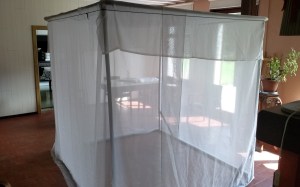 Daarom hebben we nagedacht over een oplossing die eenvoudig te monteren is met producten op de markt met behulp van rationele afmetingen om overtollige stof te voorkomen. We hebben daarom een structuur gemaakt met een zeil van 8 m bij 3 m breedte die 1100 € kost met een interne afmeting van 1.8m * 2m * 1,9m hoog. Het kan worden gebruikt voor een tweepersoonsbed van 1,6 m of als een « escape room » voor een kantoor of een rustplaats. De stof heeft een goede bescherming bij hoge frequenties, het is helder en luchtig. U kunt een andere op de markt kiezen die dezelfde afmetingen in de breedte heeft.