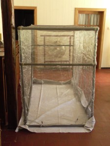 Na het ontwikkelen van verschillende modellen van vierposterstructuur, zijn we nu verder gegaan met het werk van naaister om verschillende beschermende stoffen te assembleren. We monteren rekening houdend met de breedtes van de stoffen de hele envelop die op de structuren komt te rusten. De grootste moeilijkheid zit hem in de grootte van mijn klusjesmanvingers. Van loodgieterswerk naar het rijgen van een draad is als lopen op water met schaatsen. Er is een probleem.