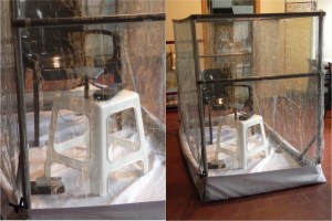 Voilà, nous avons enfin pu procéder au test du prototype du baldaquin avec le nouveau tissu. Le premier essai n’avait pas été concluant à la suite d’un problème d’herméticité de la porte. Ce problème résultait principalement de mon avarice (quand on se nomme LERAT, c’est normal), j’ai don cassé ma tirelire et rajouté un morceau de tissu supplémentaire pour l’entrée. J’ai également rajouté des bandes dans les coins du bas qui n’étaient pas hermétiques.