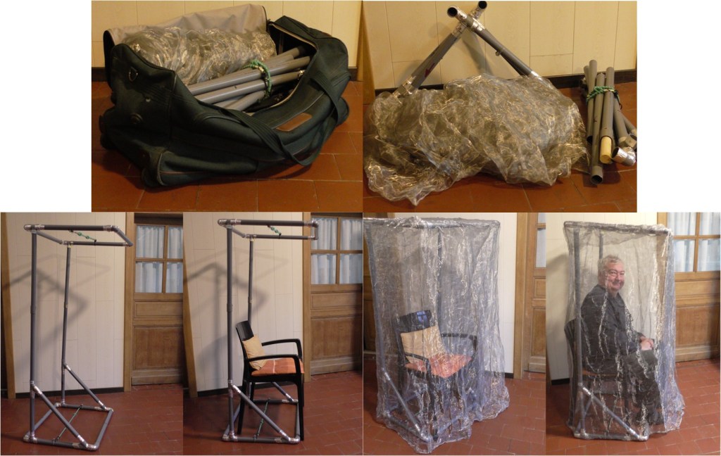C’est ainsi que nous avons conçu la première structure en urgence pour pouvoir y déposer un voile de protection. Le problème était limité au départ aux hautes fréquences des smartphones et du WIFI, nous n’avons pas travaillé sur les basses fréquences. Il fallait une structure facilement transportable (poids et dimensions), d’un montage aisé et d’un coût abordable.