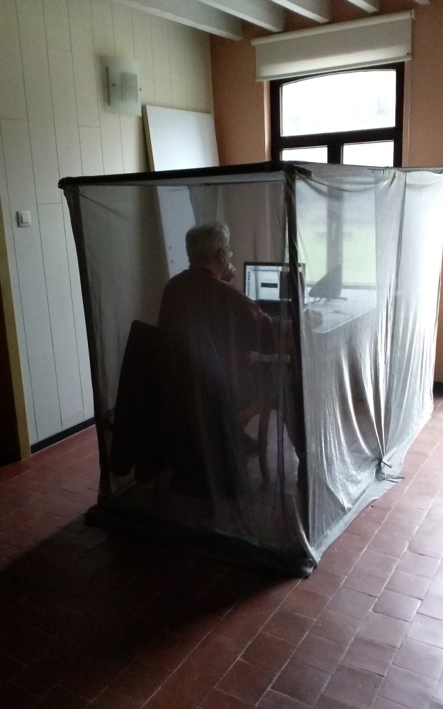 Ce mercredi 21/02/2024, ma locataire actuelle est venue avec le tissu du baldaquin qu’elle utilise en Hollande pour se protéger. Elle se plaint de continuer à souffrir sous cette protection. Comme, nous sommes actuellement occupés à réaliser un baldaquin pour lit 2 places, nous avons profité de la structure pour y poser son tissu et faire des tests d’efficacité.