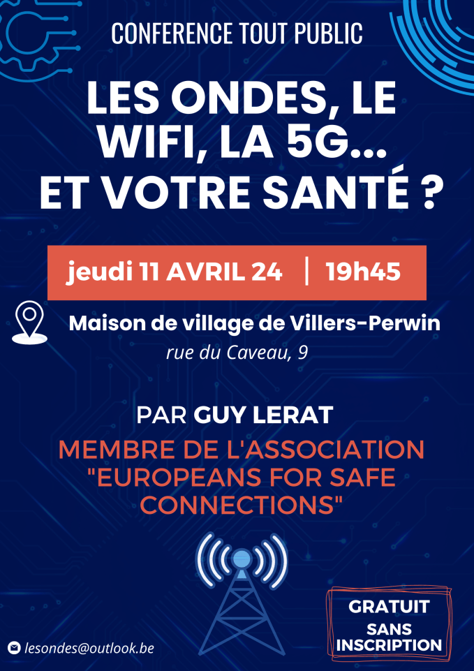 Entre la confection de baldaquins, nous sortons encore pour donner des conférences. La prochaine est destinée à informer la population en général et aura lieu à Villers-Perwin, en région wallonne à côté du village de Rèves. Cette conférence portera principalement sur la technologie qui fait maintenant intégralement partie de notre quotidien et qui impacte notre santé et l’environnement. Des solutions existent pour se prémunir en adaptant nos habitudes et protéger les générations futures.