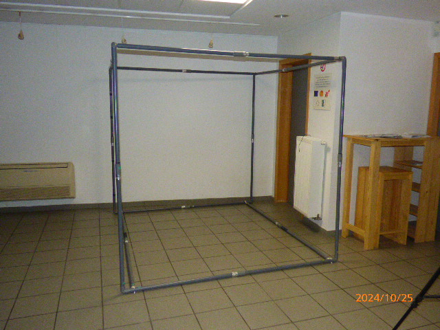 Et puis le jour J arrive, la conférence est prête, 2 semaines qu’elle tourne en rond dans ma tête toutes les nuits et il faut aller préparer la salle. L’endroit est particulièrement exposé en ondes car situé en plein centre de Chimay. Le local se situe à la maison du tourisme et ce n’est pas le WIFI qui manque. Plutôt que de me plaindre de l’exposition de l’endroit, je vais m’en servir à mon avantage en tirant parti des baldaquins en Adamantan003. Ce ne sera pas parfait (0 ondes) mais suffisant pour donner ma conférence sans être exposé. Nous n’avons pas oublié les EHS et pour qu’ils puissent participer, nous leur avons réservé un grand baldaquin d’où ils pourrons participer à l’expérience sans être trop exposé.