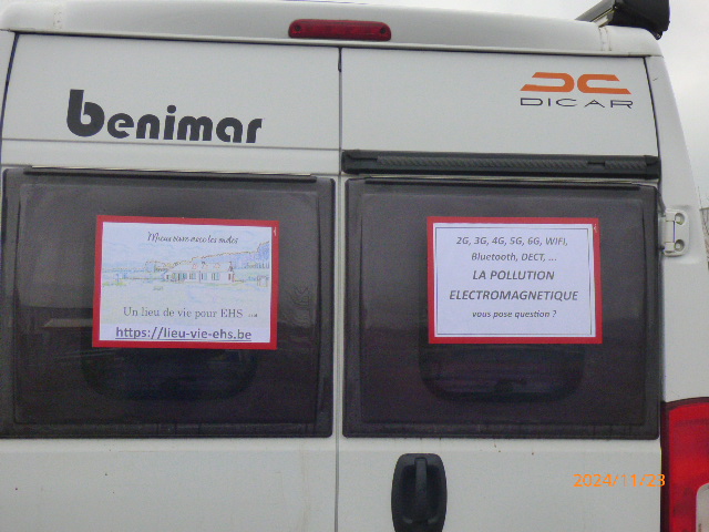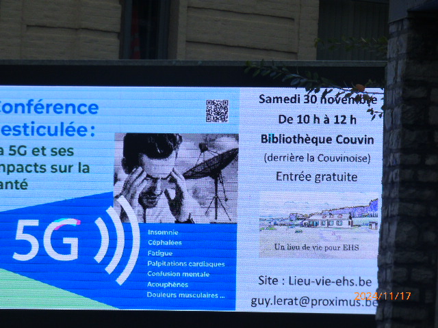 Notre action peut sembler désuète mais le but n’est pas de convaincre la majorité de la population, juste porter le message à ceux qui feront peut-être le lien avec la pollution électromagnétique. Dans le même temps, ils annoncent à la TV et dans les journaux, la disparition de la 2 G dans les prochains mois et la nécessité de remplacer son vieux Nokia par un appareil plus performant pour les fêtes. Au moment où j’écris ces lignes, je reçois un appel sur ma ligne, pour m’inviter à aller chercher mon cadeau, une montre connectée, dans un nouveau magasin dans la région. Le Monsieur qui fait son travail ne comprend pas pourquoi je ne veux pas de montre connectée, il insiste et me propose de l’offrir à quelqu’un d’autre. Je ne veux pas de mal à mon prochain et je n’offrirai jamais ce genre de niaiserie à une connaissance.