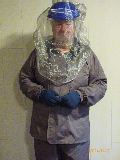 Le corps est entièrement protégé et sur la tête, nous utilisons le casque sur lequel est posé un filet lesté en Adamantan003. Le tissu est tendu sur le casque avec des aimants en néodyme. De jour et malgré le brouillard, cette solution n’altère pas la visibilité et protège bien la tête et les yeux sans être trop lourd à porter. Pour boire ou éternuer, il suffit de lever la visière. Mon épouse a un modèle avec visière plastique, moi qui ait tendance à générer de la buée j’ai juste le tissu tendu sur une armature. La solution est idéale pour la journée mais le soir avec le brouillard et le scintillement des phares et des antibrouillards, la solution devient fatigante pour les yeux. Je l’ai pourtant porté 7 heures sans interruption.