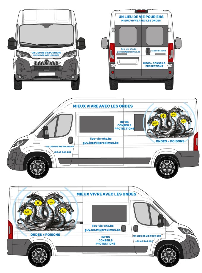 Trop tard pour faire marche arrière, la commande est passée. Bientôt sur nos routes en Wallonie circulera ce véhicule. Son but est double, attirer l’attention sur la problématique des ondes et servir de point d’information sur comment se protéger. Nous circulerons de marché en marché au grès des lieux de conférence et nous tiendrons des permanences pour informer.