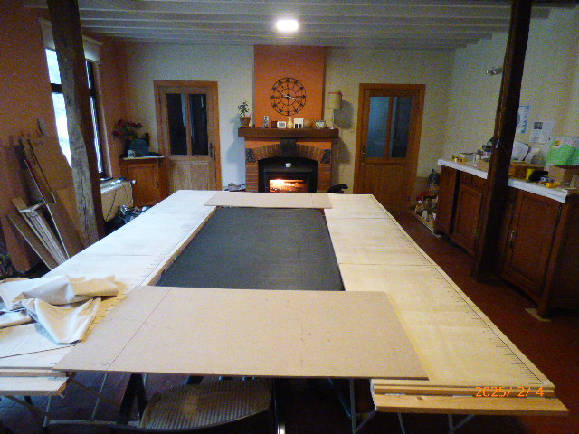 Nous avons donc décidé de fournir systématiquement un tapis de sol avec les baldaquins. Cela demande une certaine place pour les confectionner et des artifices pour pouvoir travailler les tissus. 230 cm sur 240 cm implique un lieu de travail adapté et des supports amovibles. Entre les baldaquins et les tapis de sol, nous n’avons pas pu choisir, on travaille en alternance.