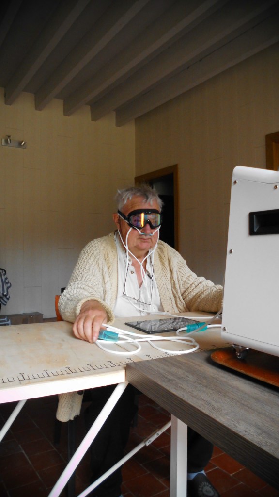 Ici, à Rièzes, nous vivons dans un environnement protégé en pleine nature entouré de sapins. Nous sommes protégés naturellement. Pour pomper des électrons, il me suffit de promener pieds nus dans l’herbe. Pour la méditation, j’ai ma marre avec les grenouilles,… Mais parfois, nous sommes obligés de sortir et de s’exposer à la pollution électromagnétique. Il y a deux mois, c’était un vrai cauchemar de mettre un pied dans la civilisation. Automatiquement, je boitais, j’étais confus et il me fallait beaucoup de temps pour me remettre. Je suis depuis la mi-mai une cure d’hydrogénothérapie à raison de 2 fois 30 min par jour. Je peux maintenant sortir et je ne ressens plus rien, je marche sans canne, mes idées sont claires.