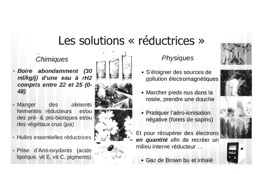 Ce qui m’intéresse et qui a retenu toute mon attention, c’est cette vision du corps électrique et son explication sur le fait que l’exposition aux champs électromagnétiques nous fait perdre nos électrons négatifs et réduit notre potentiel à être capable de mettre en oeuvre diverses réactions biochimiques de notre corps. On peut réduire cette perte d’électron par divers moyens : en se mettant à la terre, en se protégeant des ondes, en complémentant notre alimentation avec des aliments fermentés, etc …