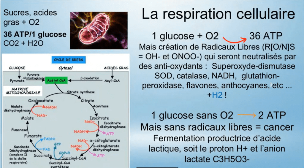 L’hydrogène donneur d’électron est à la fois le moteur de la génération de l’ATP et un chasseur de radicaux libres. L’utilisation de l’hydrogène est applicable aux EHS pour neutraliser les radicaux libres mais aussi utile dans un bon nombre de traitement de nombreuses pathologies. Je vous invite réellement à suivre les vidéos de Janecek sur l’apport en hydrogène. L’hydrogène, donneur d’électron vient aider l’ensemble de nos organes pour éviter l’oxydation et non l’oxygénation. Le cerveau consomme 18 kg d’ATP, produit par nos mitochondries.