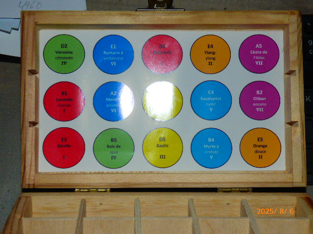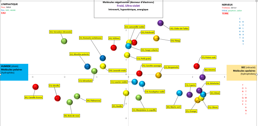 On continue les séances et l’étude maintenant de la bioénergie de Vincent. On complète tout cela avec la représentation triangulaire des huiles essentielles de Philippe Mailhebiau. Notre boîte de 70 huiles constituées !l y a une dizaine d’année nous sert à merveille.