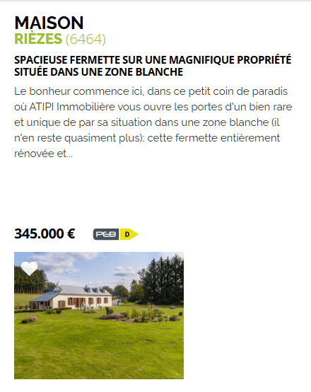 Nous avons confié le mandat à l’agence ATIPI à Chimay. Vous pouvez retrouver des photos récentes du bien sur leur site ou sur Immoweb.be. Les coordonnées d’ATIPI sont
