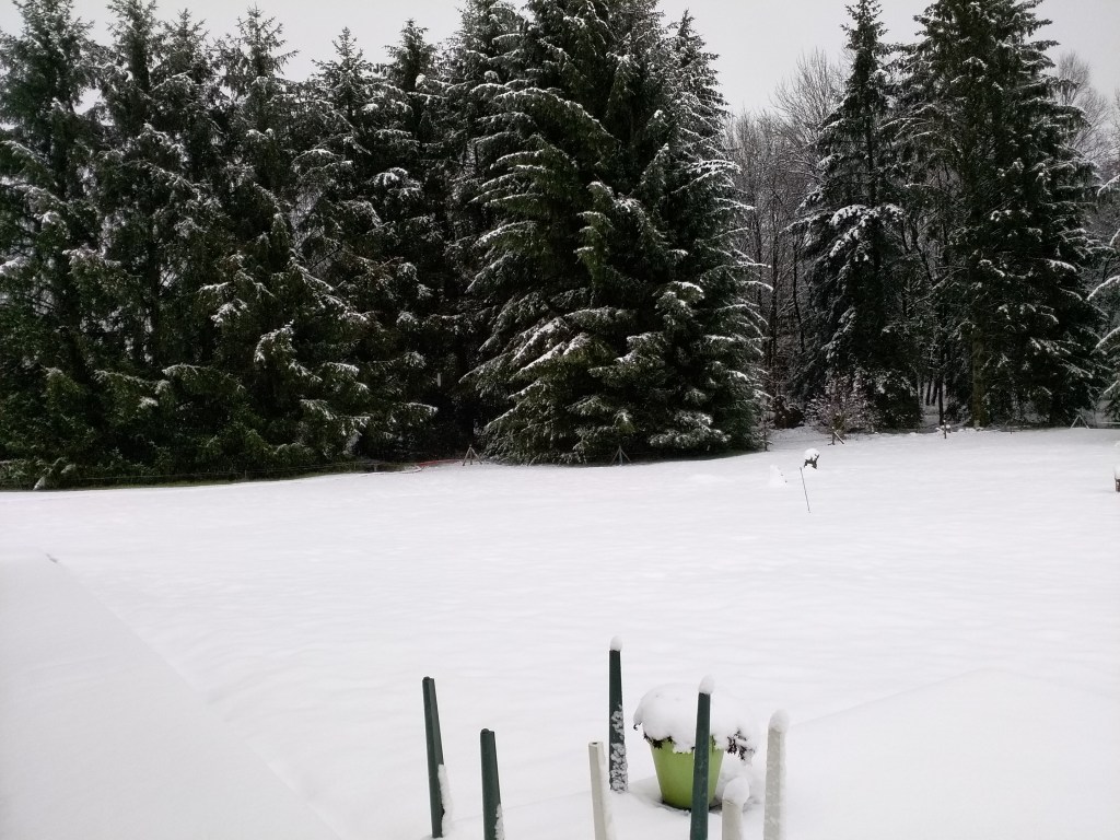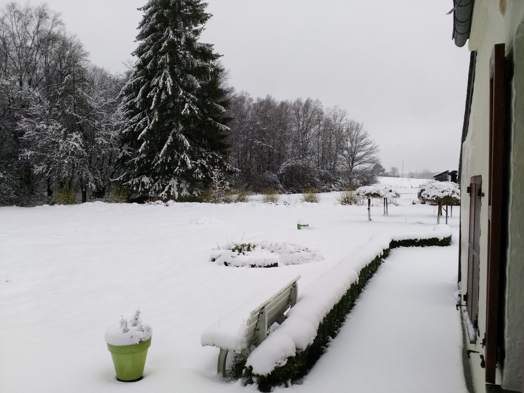 La maison est équipée d’une chaudière à mazout, d’un poêle à bois, d’un poêle à pellets et a été complètement isolée au niveau de la toiture. Le soucis est pour les animaux, il faut prévoir de la paille et de l’eau fraiche chaque jour. Mais quoi de plus comique que de voir la canne circuler ou les moutons faire des bonds dans la neige. Les grenouilles sont parties mais elles reviendront au printemps prochain avec leurs croassements.