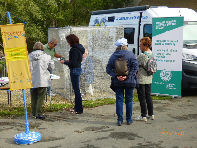 Ce genre d’opération fait partie de notre philosophie de travail pour sortir du microcosme des EHS et faire connaître la problématique des ondes à un plus grand nombre. J’avais parfois l’impression durant la journée d’être un bonimenteur public face aux gens qui s’amassaient en grappe autour de nous. Je suis sorti de nombreuses fois de mon baldaquin pour inviter les gens à comparer les mesures dedans et en dehors. Nous avions un appareil de mesure avec nous et les comparaisons étaient sans appel.