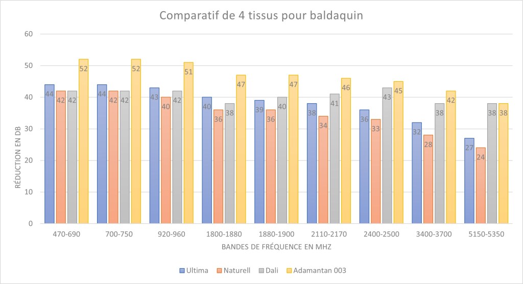 Dans mes travaux de comparaison, j’avais analyser les protections disponibles sur le marché en les comparant en terme d’efficacité en fonction des fréquences et en terme de prix. Cette recherche avait été faite sur base des données disponibles chez les fournisseurs. Depuis les puissances d’émission ont augmenté, les sources de pollution se sont multipliées mais pour l’heure, le tableau reste valable. On devra bientôt envisager la double couche pour pouvoir se protéger correctement. Cette double couche n’est envisageable que posée sur une structure. La protection doit être efficace en terme de performance et rester transparente et respirable. C’est la raison, entre autre, pour laquelle nous avons opter pour l’acier inoxydable, adamantan003, et que nous avons appris à le coudre pour en faire une enveloppe qui vient se poser sur une structure. Nous avons élargi son utilisation à la fabrication de tapis de sol pour permettre une protection optimale également par le sol sous le lit.